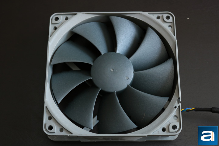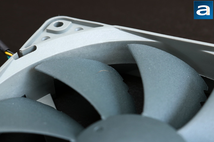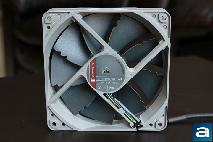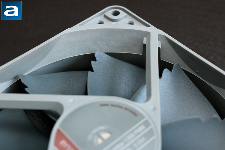 The Noctua NF-P12 Redux has nine blades, which according to Noctua, are specifically designed for high pressure environments. The nine closely spaced fan blades ensure that high static pressure can be achieved at much lower RPMs. The addition of the notches along the outer edges of the impellers are required because of the added blades in the fan. These added blades would cause more noise, but the notches help to reduce noise, as well as increasing efficiency. The notches help to redirect how the air is pulled through the impellers. Noctua has a full page describing in more detail how these extra blades work with the notches. The picture above and the picture below help you to see how the notches are placed.