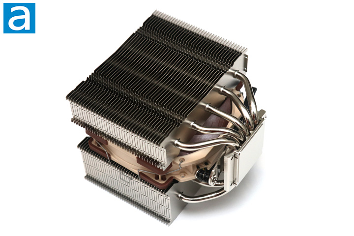 From the base where the metal makes contact with the processor, five continuous U-shaped heatpipes lead away from the CPU contact and splits into the two stacks of fins. This effectively makes ten heatpipes in total. The heatpipes are supposed to efficiently lead the heat away from its source due to the low heat of vaporization, or phase change energy, of the fluid inside. The heatpipes are aligned in manner to spread out the heat in the array of radiating fins. The 0.74 m² of surface area, combined with the 120mm NF-A12x25r PWM fan, should be able to deliver very good heat dissipation performance, but we will see if this statement is true on the next page.
