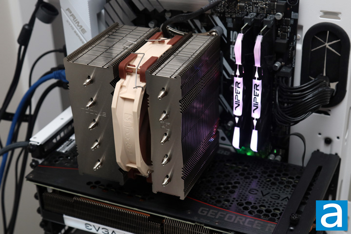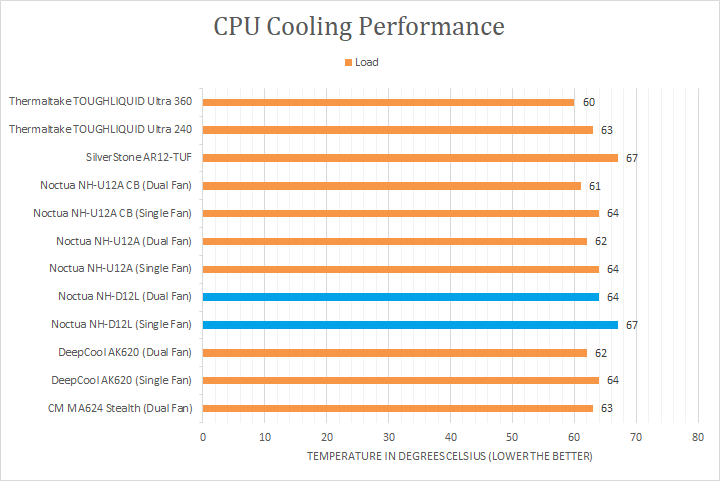 With a sufficient amount of time to load the processor, you can see how all of the coolers performed with the peak temperatures recorded. From here, you can once again see the NH-D12L was a good air cooler overall, although there were some concessions to make. For one, with a single fan attached, it reached 67c under load, which is a couple degrees warmer than the NH-U12A. With two fans attached, this was further reduced down to 64c. The NF-A12x25r PWM fans worked well, whether by itself or in tandem, to generally keep temperatures lower, but the NH-U12A was still a notably better performer. Even so, the NH-D12L was still very capable at keeping this processor cool while having enough headroom for the CPU to maintain its boost frequencies.