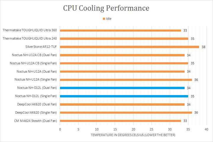 As for the sound analysis section of the Noctua NH-D12L, on a scale of 0 to 10, where 0 is silence, and 10 is the definition of loud, I would rate the NH-D12L at 2.5/10 during idle and around 3.5/10 under full load. With a second fan attached, the noise increased to around 4.0/10. Once again, the NF-A12x25r PWM fan, on a day-to-day use, is very quiet and rotates about without much noise. When you push your computer to greater loads, as we did in Prime95, you will start hearing the fans whirring on, but this is not much louder than even some of our single-fan competition. The noise that it does emit is lower in frequency and thus is not as noticeable to the ear as some of its competition, which again shows Noctua's expertise in cooling.