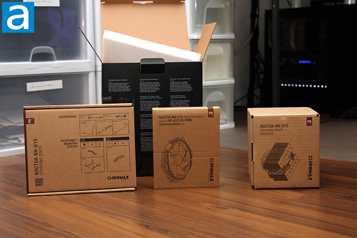 Out of the box, you will be greeted by three more boxes. All of them are raw corrugated cardboard boxes, and are printed and labeled in black ink to show you what is inside. The biggest one of them holds none other than the NH-D15 chromax.black heatsink itself, which already has one NF-A15 HS-PWM chromax.black fan pre-installed. A second NF-A15 HS-PWM chromax.black is included in a separate box. The smaller box holds the mounting accessories with everything nicely separated into their own bags placed in separate partitions. The black SecuFirm2 mounting kit allows the Noctua NH-D15 chromax.black to work with Intel's LGA20xx, LGA1200, and LGA115x sockets, as well as AMD's AM2, AM2+, AM3, AM3+, FM1, FM2, FM2+, and AM4 sockets.