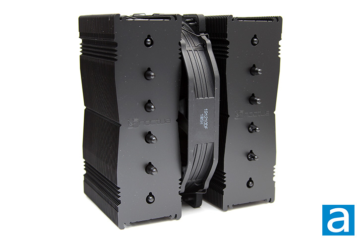 Those who are familiar with the lineup will know the Noctua NH-D15 chromax.black is a mega-sized heatsink. Six continuous U-shaped heatpipes lead away from the CPU contact base in two opposing directions for twelve effective heatpipes. Those heatpipes then go through two separate radiators, one on each side, to dissipate the heat into the surrounding environment. Theoretically, the heatpipes are supposed to efficiently lead the heat away from its source due to the low heat of vaporization, or phase change energy, of the fluid inside. The heatpipes are aligned in a linear manner to evenly distribute the heat in the radiating fins, as the NH-D15 series is really two reduced weight NH-U14S heatsinks stuck together. The Noctua NH-D15 chromax.black come at the cost of physical size; its height of 160mm and width at 150mm is pretty standard, but its length is the one that makes it literally stand out. In standard configuration, with one fan mounted in the middle, it already comes in at 135mm. Add an extra fan to the front, and this figure jumps to 161mm. That said, with 1.2 square meters of surface area, combined Noctua's excellent NF-A15 HS-PWM chromax.black fan specifically designed for heatsinks with a high amount of static pressure, you are definitely going to get some serious cooling performance and low noise levels -- something we will investigate on the next page.