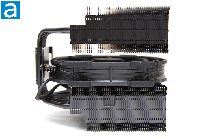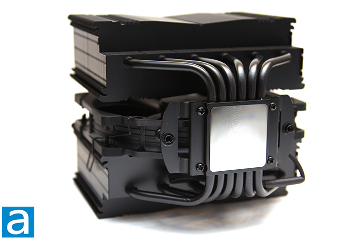 A shot of the bottom of the Noctua NH-D15 chromax.black CPU heatsink. The photo above shows the configuration of the heatpipes more clearly in relation to the base leading into the fin array. The contact base of the Noctua NH-D15 chromax.black has a clean and flat finish for optimal performance. Like all Noctua heatsinks we have reviewed in the past, the NH-D15 chromax.black is a copper and aluminum hybrid heatsink electroplated with nickel. The difference, of course, is everything is painted matte black other than the base. The vital parts such as the base and heatpipes are built using copper for best heat transfer ability with a thermal conductivity of 401 W/mK. The heatsink fins utilize aluminum as its material due to its lightweight properties as juxtaposed to copper. This is to allow the construction of larger heatsinks without stressing too much on the motherboard due to weight. Aluminum has a thermal conductivity of 237 W/mK, which is not as optimal for heat transfer compared to copper, but it is much lighter.