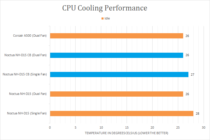 In the load test, the test processor, my Intel Core i7-6700K overclocked to 4.60GHz, generates quite a bit of heat that will push any cooler to the limits. The Noctua NH-D15 chromax.black delivered the best performance among all coolers. The NH-D15 chromax.black in dual fan configuration was 2c better than the Corsair A500 with both its fans running at full speed. What I was surprised at the most was the Noctua NH-D15 chromax.black was consistently 3 degrees cooler than the regular NH-D15. While this validates the fact the black finish does not change the performance of the cooler, it does not explain why it turned out even better results. In my opinion, this may be partially due to a slight loss in performance of the original NH-D15 over time. The NH-D15 used for comparison was the original one I used for review in 2014, and since then, it has been subject to many temperature cycles by running in my main PC that I turn on every morning and turn off every night. In case you ask, there is no dust in the cooler, since it has been thoroughly cleaned prior to testing. Noctua points out there could be additional contributing factors. First, there is a 0.5c performance tolerance between coolers. Second, since neither the CPU nor the heatsink is completely flat, one cooler may fit one CPU better than another. Third, improvements in production processes may cause the latest units off the manufacturing line to be better than old models. All of the factors above likely made the 3c difference in the end. Noctua assures all NH-D15 models sold today will have pretty much identical performance regardless of color.
