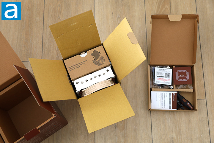 Out of the box, you will be greeted by two more boxes. All of them are raw corrugated cardboard boxes, and are printed and labeled in black ink to show you what is inside. The bigger one of them holds none other than the NH-D15 G2 HBC heatsink itself, which already has two NF-A14x25r G2 fans pre-installed. The smaller box holds the mounting accessories with everything nicely separated into their own bags placed in separate partitions. The SecuFirm2+ mounting kit allows the NH-D15 G2 HBC to work with Intel's LGA1851, LGA1200, and LGA115x sockets, as well as AMD's AM5 and AM4 sockets.