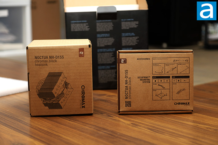 Out of the box, you will be greeted by two more boxes. All of them are raw corrugated cardboard boxes, and are printed and labeled in black ink to show you what is inside. The bigger one of them holds none other than the NH-D15S chromax.black heatsink itself, which already has an NF-A15 HS-PWM chromax.black fan pre-installed. The smaller box holds the mounting accessories with everything nicely separated into their own bags placed in separate partitions. The black SecuFirm2 mounting kit allows the Noctua NH-D15S chromax.black to work with Intel's LGA20xx, LGA1200, and LGA115x sockets, as well as AMD's AM2, AM2+, AM3, AM3+, FM1, FM2, FM2+, and AM4 sockets.