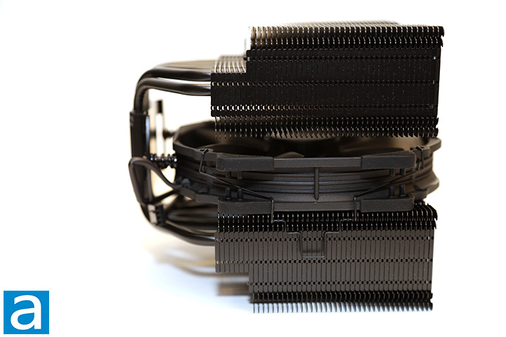 Those who are familiar with the lineup will know the Noctua NH-D15S chromax.black is a mega-sized heatsink. Six continuous U-shaped heatpipes lead away from the CPU contact base in two opposing directions for twelve effective heatpipes. Those heatpipes then go through two separate radiators, one on each side, to dissipate the heat into the surrounding environment. Theoretically, the heatpipes are supposed to efficiently lead the heat away from its source due to the low heat of vaporization, or phase change energy, of the fluid inside. The heatpipes are aligned in a linear manner to evenly distribute the heat in the radiating fins, as the NH-D15 series is really two reduced weight NH-U14S heatsinks stuck together. The Noctua NH-D15S chromax.black come at the cost of physical size; its height of 160mm and width at 150mm is pretty standard, but its length is the one that makes it literally stand out. In standard configuration, with one fan mounted in the middle, it already comes in at 135mm. Add an extra fan to the front, and this figure jumps to 161mm. That said, with 1.2 square meters of surface area, combined Noctua's excellent NF-A15 HS-PWM chromax.black fan specifically designed for heatsinks with a high amount of static pressure, you are definitely going to get some serious cooling performance and low noise levels -- something we will investigate on the next page.
