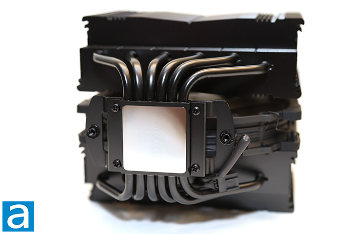 A shot of the bottom of the Noctua NH-D15S chromax.black CPU heatsink. The photo above shows the configuration of the heatpipes more clearly in relation to the base leading into the fin array. As mentioned earlier, the fin stack is offset slightly with relation to the base, so it is biased towards the upper edge of the motherboard to prevent interference with the first expansion slot. The contact base of the Noctua NH-D15S chromax.black has a clean and flat finish for optimal performance. Like all Noctua heatsinks we have reviewed in the past, the NH-D15S chromax.black is a copper and aluminum hybrid heatsink electroplated with nickel. The difference, of course, is everything is painted matte black other than the base. The vital parts such as the base and heatpipes are built using copper for best heat transfer ability with a thermal conductivity of 401 W/mK. The heatsink fins utilize aluminum as its material due to its lightweight properties as juxtaposed to copper. This is to allow the construction of larger heatsinks without stressing too much on the motherboard due to weight. Aluminum has a thermal conductivity of 237 W/mK, which is not as optimal for heat transfer compared to copper, but it is much lighter.