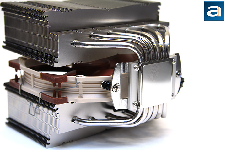A shot of the bottom of the Noctua NH-D15S CPU heatsink. The photo above shows the configuration of the heatpipes more clearly in relation to the base leading into the fin array. As mentioned earlier, the fin stack is offset slightly with relation to the base, so it is biased towards the upper edge of the motherboard to prevent interference with the first expansion slot. My only complaint is the Noctua logo at the top of the heatsink will actually be upside down if you install the NH-D15S correctly, which does not make sense to me. Conversely, if you install the NH-D15S with the Noctua logo right side up, the fin array will be biased downwards, causing additional interference with your expansion slots. This is purely a cosmetic issue, but for a company that has an excellent history of focusing on the details, I do not believe my complaint is out of hand.
