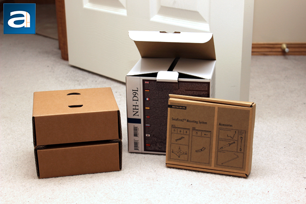 Out of the box, you will find two more boxes, which is a convention Noctua seems to love. If I have ranted enough in my past reviews about amazing packaging, I have to say Noctua takes top marks, but for an entirely different reason. Noctua's approach to packaging is exceptional for being functional. All of the accessories and parts included are in separate boxes and sealed bags, so users know exactly where to find the part they are looking for. Intel parts are kept away from AMD parts with separate labeled bags, and even inside the cardboard container they are split off. Even more so, the accessories box is labeled with everything you will find inside, so users know exactly what they have from the get-go. Whether it is a Noctua philosophy, or an Austrian ideal to be neat and tidy, this is just excellent. Included in the accessories box are the SecuFirm2 mounting kits, which are compatible with Intel's LGA2011 and LGA 115x sockets, as well as AMD's AM2+, AM3, AM3+, FM1, FM2, and FM2+ sockets. Other accessories include a low noise adapter, screwdriver, second set of fan clips, fan corner rubber dampeners, case fan screws, and a case badge. The NH-D9L also ships with a full sized tube of Noctua's excellent NT-H1 thermal compound, which we had reviewed back in our August 2008 shootout. The NH-D9L heatsink and pre-attached NF-A9 fan are stored in the other cardboard container as you can see. But enough with this packaging, let us take a dive into the cooler itself.