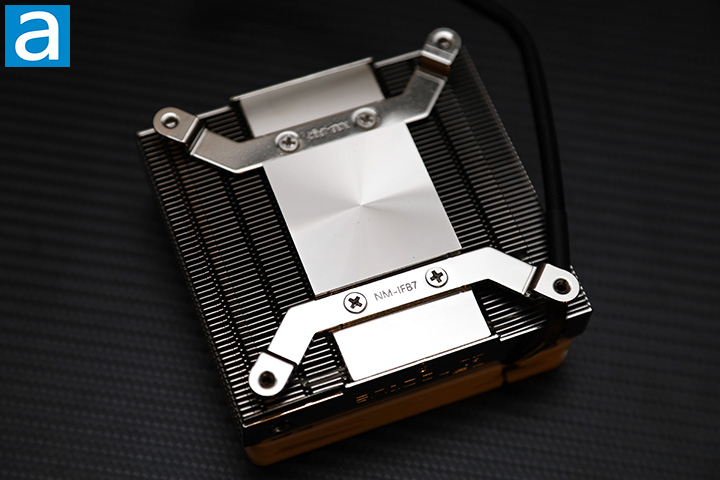 I really enjoy reviewing small coolers because of how dense they usually are. The NH-L9i-17xx is much like other L-series, with a single stack of horizontal fins and some heatpipes going through it. As this cooler shares the same "L9" name as the NH-L9i for other Intel sockets, it is not surprising the NH-L9i-17xx looks similar in size and build. As such, we have two heatpipes that come out of the bottom base and down the sides of the fins. It is also available in chromax.black, which has a full matte black finish on the heatsink and fan instead of our current unit with traditional Noctua colors. The heatsink is made out of aluminum and nickel plated around the entire unit. Noctua's owl logo can be found on each side of the heatsink and is generally hidden once it is installed.