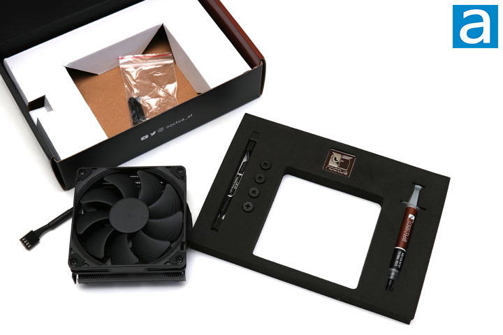 Opening this box up, the Noctua NH-L9i chromax.black comes in a single cardboard cutout with a foam cutout on top to hold the accessories. As you can see, we have the CPU cooler with the fan attached in the middle of the box. The foam cutout holds accessories like the mounting screws, low noise adapter, Noctua case badge, and a tube of Noctua NT-H1 thermal grease. It is a shame that we still have yet to see their newer NT-H2 with their coolers yet and I hope the update happens soon. There is a set of longer screws included, and this is actually so users can install 92mm fans that are 25mm thick as opposed to the 14mm fan that is currently mounted here. Finally, the black SecuFirm2 mounting kit included allows the Noctua NH-L9i chromax.black to work with Intel's LGA1150, LGA1151, LGA1155, LGA1156, and LGA1200. It also works with AMD AM4 sockets, assuming you get the Noctua NM-AM4-L9aL9i adapter. Alternatively, team red is also covered by the Noctua NH-L9a-AM4 chromax.black. Full compatibility with processors and their specified thermal design power can be found through Noctua's website. In addition to all this, Noctua has included a manual to show you how to install the cooler. The instructions are generally clear with easy to understand instructions.