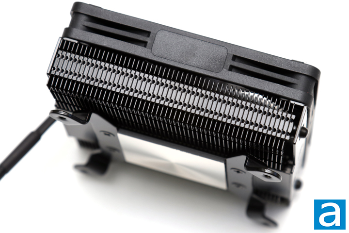Out of the base of the Noctua NH-L9i chromax.black are two heatpipes, splitting to each side. The bend out and go back through the array of fins on each side. While it is not exactly a symmetrical design, you should be able to mount the NH-L9i chromax.black in either of the two orientations without worrying of affecting cooling performance. The heatpipes are around 6mm in diameter, and like the base, is a copper core with a nickel plating on the outside. Heatpipes are supposed to efficiently lead the heat away from its source due to the low heat of vaporization, or phase change energy, of the fluid inside. The heatpipes are aligned in a manner to spread out the heat in the single array of radiating fins. These pipes along with the fins and the fan attached should be able to dissipate heat quite well, but we will see if this is true in our performance tests.
