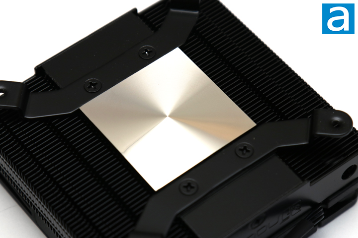 From the photo above, you can see the bottom of the Noctua NH-L9i chromax.black CPU heatsink. Unsurprisingly, the base is very flat, which means it should rest evenly on the processor. After a quick inspection, I was not able to see any abnormalities, though you can see the circular milling marks. As such, it is important that you use some sort of thermal grease between the base and your processor to fill in these smaller gaps. As you can tell, the chromax.black finish is everywhere around the heatsink besides the base, which is understandable. As we have seen from past Noctua heatsinks, this heatsink is composed of copper, nickel, and aluminum. The base and heatpipes are built using copper for best heat transfer ability with a thermal conductivity of 401 W/mK. The heatsink fins utilize aluminum as it is quite a bit lighter in comparison to copper. This compromise allows the NH-L9i chromax.black to reduce its weight and thus reducing the stress on the motherboard. Aluminum has a thermal conductivity of 237 W/mK, which is not as optimal for heat transfer, but the trade-off is understandable.