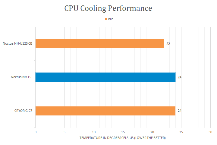After letting my computer sit idle for a while, I went to take a look at the core temperatures. From the first graph, you can see the Noctua NH-L9i chromax.black was idling at a slightly higher temperature compared to the other coolers with a result of 24c. This is not too surprising, considering how much smaller the NH-L9i chromax.black is compared to the much larger tower-style coolers. However, the CRYORIG C7 also idles at the same temperature. A total difference of two degrees over all of the cooling options is a pretty boring result, but idle results do not give a full representation of what CPU coolers can do, so we opened up Prime95 and started the tests to see what would happen.