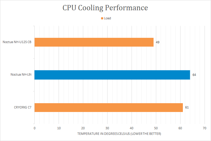 With a sufficient amount of time to load the processor, you can see how each of the coolers performed with the peak temperatures across all the cores and threads. Once again, the Noctua NH-L9i was able to keep the Intel Core i5-6600K relatively cool, with a decent temperature of 64c. Compared to the larger NH-U12S chromax.black, this was quite a bit hotter. The CRYORIG C7 was cooler than the Noctua by about three degrees, but it should be noted the C7 is 10mm taller at 47mm. Thus, it does have a larger surface area to dissipate heat. Thankfully, the Intel CPU was able to reach the same boost clocks across all cores for all of our coolers tested. Overall, the results here were not necessarily the most impressive, but this was expected considering the overall dimensions and the purpose of the low-profile cooler.
