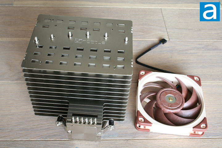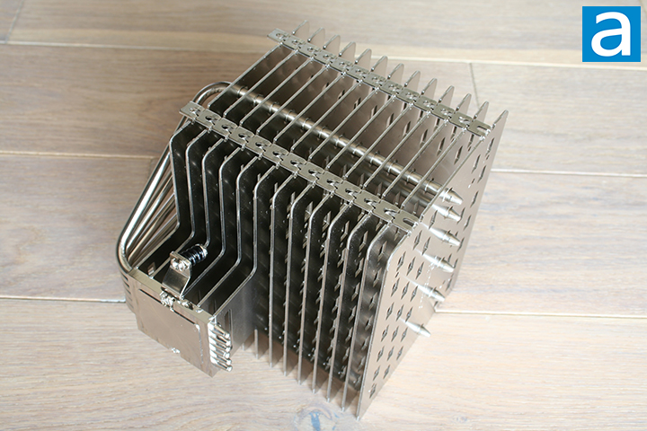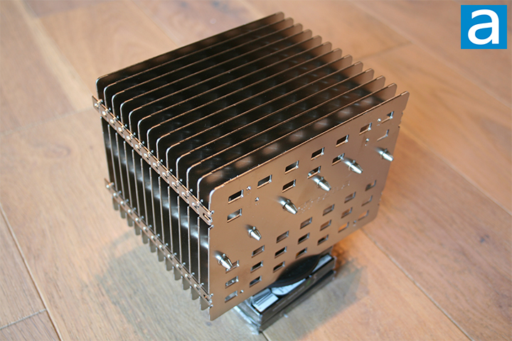 Looking at the top, we can get a better look at the design of the leading edges of the heatsink fins. Due to its passive performance, the Noctua NH-P1 is clearly built different from other air coolers we have reviewed. For one, it is quite a bit larger with very big fins. They are organized in a rectangular shape, but do not necessarily require the same sort of "leading edge" since you do not need to have a fan attached to the heatsink. All fins are the same size from front to back. The fins are spaced out enough for the included screwdriver to fit in between for installation. The heatpipes are exposed on the heatsink.