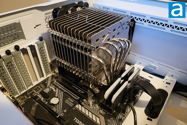 When it comes to dimensions, the Noctua NH-P1 has a height of 158mm, width at 154mm, and 152mm depth. This is about the same as the NH-D15's 160mm specification, which might make the NH-P1 harder to fit inside smaller form factor cases. Six continuous heatpipes can be seen from the base leading up for heat dissipation. The purpose of the heatpipes is to efficiently lead the heat away from its source due to the low heat of vaporization, or phase change energy, of the fluid inside. The heatpipes are aligned in a manner to spread out the heat in the single array of radiating fins. With a total surface area of 0.61 square meters, the NH-P1 should be able to deliver good heat dissipation theoretically, which I will test on the next page. This CPU cooler is aligned such that no parts of the cooler will be hanging over the PCI Express slot underneath. However, depending on the orientation of mounting, the cooler may hang over the RAM slots. It is, however, possible to avoid this if you orient the cooler with the heatpipe bends hanging over the memory area. As we have mentioned already, this cooler has full compatibility with the modern Intel LGA115x, LGA1200, and AMD AM4 sockets.