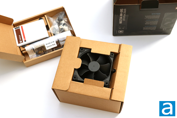 As with most of the Noctua packaging, the NH-U9S chromax.black comes with two more boxes inside. All of these are raw corrugated cardboard boxes with one printed and labeled in black ink to show you the contents. The bigger one with the exposed Noctua NF-A9 fan is none other than the NH-U9S chromax.black heatsink itself with the aforementioned fan attached. The smaller box holds mounting accessories with everything separated nicely into their own partitions and plastic bags if necessary. This includes a black SecuFirm2 mounting kit to mount into Intel's LGA1200 and LGA115x sockets. AMD's AM2, AM2+, AM3, AM3+, FM1, FM2, FM2+, and AM4 utilize a separate backplate or the backplate included with your motherboard.