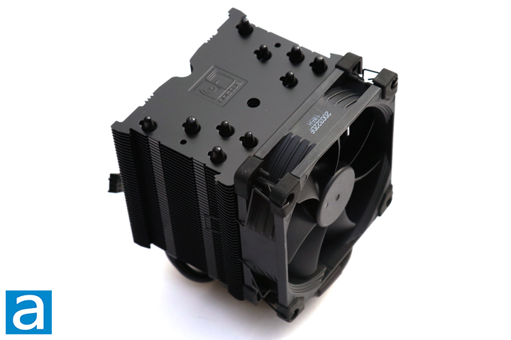 As expected from the name, the Noctua NH-U9S chromax.black is an all-black version of the original NH-U9S. It is designed like other U-series Noctua coolers with a single stack of fins and several heatpipes going through it. As we have already reviewed the vanilla NH-U9S, the real difference here is the color. Its full matte black finish on both the heatsink and the fan is truly beautiful. While there are other manufacturers that have employed this color on their CPU coolers, I am quite happy to see Noctua do this. There is a black coating over all of the heatsink, but it was important that this coat does not increase thermal resistance and impact its ability to move heat away. The heatsink is still made out of aluminum around the entire unit with a nickel plated copper base. Noctua's owl logo can also be found engraved on top, which is a nice touch.