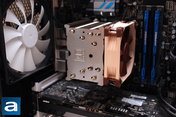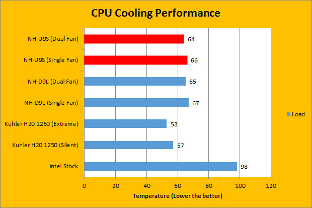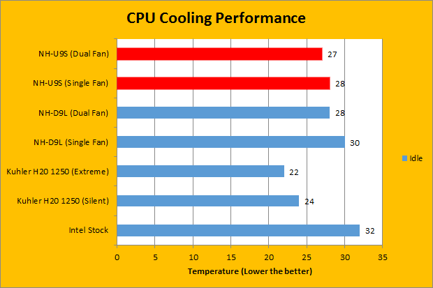 All tests were run in our custom built computer to best reflect real life performance. The computer remained in the same place and room throughout all tests. The ambient room temperature in the room was around 22c. The thermal paste applied to each cooler was stock respective to their manufacturers to rate its performance; all pastes had sufficient time for them to fully settle. The fans on all heatsinks were connected to the same motherboard 4-pin connector, using a splitter provided with the NF-A9 fans in the case of the dual fan setup. The test computer was turned on and idling for at least one hour for the idling tests. High CPU load results were obtained using the Prime95 in-place large FFTs test with four worker threads for a minimum of ten minutes, and recorded when the temperature is deemed stable. The Intel stock cooler was chosen as a baseline reference. It is a good heatsink to figure out the delta between the reference unit and the tested product for standardizing performance against other coolers, even if not compared directly against. In addition, we compared the NH-U9S with the NH-D9L in both single and dual fan configurations, and the Antec Kuhler H2O 1250. While we do not expect the NH-U9S to actually compete in the Antec Kuhler's class, it is present for perspective's sake. Temperature results were measured with RealTemp, which reports the CPU's integrated digital thermal sensor for maximum accuracy. Each of the recorded numbers are an average across the four cores.