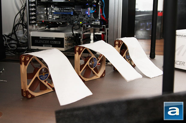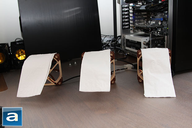 Using our tried-and-true APH proprietary 'scientific' method for measuring fan performance we devised back in 2007, it's no surprise that we're using it for this review as well -- we have used it in every fan review since then. While it is not exactly the most objective method you can use (No kidding haha), there's a few attributes of fan performance that we can obtain clearly from our observations: Airflow, airflow consistency, and amount of static pressure generated. It visually portrays characteristics of each fan.
