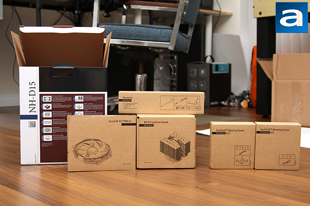 Out of the box, you will greeted by many more boxes; five to be exact. All boxes are in raw corrugated cardboard color, and are printed and labeled in black ink to show you what is inside. The biggest one of them all holds none other than the NH-D15 heatsink itself, which already has one NF-A15 PWM fan pre-installed. A second NF-A15 PWM is included in a separate box. The two smaller boxes hold the mounting accessories; one for AMD, and one for Intel. The SecuFirm2 mounting kits allows the Noctua NH-D15 to work with Intel's LGA2011 and LGA 115x sockets, as well as AMD's AM2+, AM3, AM3+, FM1, FM2, and FM2+ sockets. Accessories tagging along in the last box include two low noise adapters, Y-split cable, screwdriver, second set of fan clips, fan corner rubber dampeners, case fan screws, and a case badge. The NH-D15 also ships with a full sized tube of Noctua's excellent NT-H1 thermal compound, which we had reviewed back in our August 2008 shootout. As always from the company, the included bundle is not just about the heatsink itself -- it is also about the included excellent removable high performance fans and 'stock' thermal paste. Cooling fans such as the NF-A15 PWM are not exactly cheap when you buy them separately in retail, and two are included in the package.