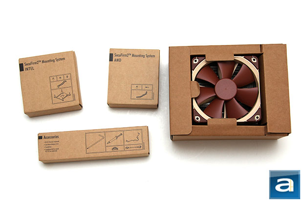 Out of the box, you will greeted by three more boxes. All boxes are in raw corrugated cardboard color; tiled next to each other in the same thickness. The two smaller boxes hold the included accessories, while the larger one contains common accessories. Unloading the accessory boxes, and taking out a cardboard spacer will reveal the heatsink itself. The Noctua NH-U12S already has a NF-F12 PWM fan pre-installed. Three individually packaged accessory bags are labeled "Intel", "AMD ", and "Accessories", respectively. The Intel and AMD sets are mounting accessories for their respective platforms -- the SecuFirm2 mounting kits allows the Noctua NH-U12S to work with Intel's LGA1366 and LGA 115x sockets, as well as AMD's AM2, AM2+, AM3, FM1, and FM2 sockets. Accessories tagging along include a low noise adapter, screwdriver, second set of fan clips, fan corner rubber dampeners, and a case badge. The NH-U12S also ships with Noctua's excellent NT-H1 thermal compound, which we had reviewed back in our August 2008 shootout. As always from the company, the included bundle is not just about the heatsink itself -- it is also about the included excellent removable high performance fans and 'stock' thermal paste. Cooling fans such as the NF-F12 PWM aren't exactly cheap when you buy them separately in retail, and one is included in the package.