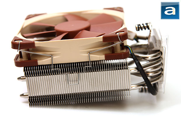 A view from the top three-quarter view of the heatsink. Noctua took elements of what they have done right with its predecessor, and further optimized it on the Noctua NH-U12S. Basically, it takes the form factor of the NH-U12P we have reviewed over five years ago, and included some elements from the NH-D14 into their latest product. As far as engineering and implementation goes, fans can be mounted on using two clips each. Only one fan is included out of the box, but installation accessories are included for the optional second 120mm unit. These wire clips are easy to attach and remove in a uniform fashion. Rubber strips on the heatsink are now superseded by integrated rubber dampeners on the included NF-F12 PWM, used to reduce mechanical noise emissions during operation, as seen in our photo above.