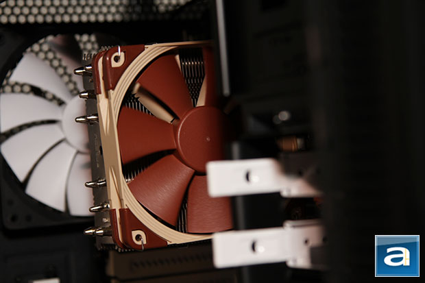 Fastening the heatsink over the CPU socket proves to be a simple job. Remove the intake fan to gain access to the spring loaded screw located on the NH-U12S heatsink itself. Align the heatsink with the screw threads on the mounting bars, and tighten the screws alternately until they stop. Overall, installation is straightforward, and Noctua's mounting system is very secure as well as distributing weight very well, even though the heatsink is not very large or excessively heavy.