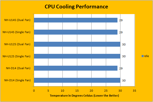 Being the little guy of the group, it is unsurprising the Intel Core i5-2405S CPU equipped with the Noctua NH-U12S resulted in the highest load temperature. This does not mean it performed horribly though. As you can see in our graph above, the NH-U12S stayed within three degrees Celsius consistently compared to its bigger brother, which is very impressive. Keep in mind the NH-U14S has a bigger fan in conjunction with nearly 40% more cooling surface area. Compared to the Noctua NH-D14, the big daddy of all air coolers, it obvious did not keep up -- nor did we expect it to. At the end of the day, the NH-U12S' slim single radiator proves to be a very efficient design, despite its relatively compact size.