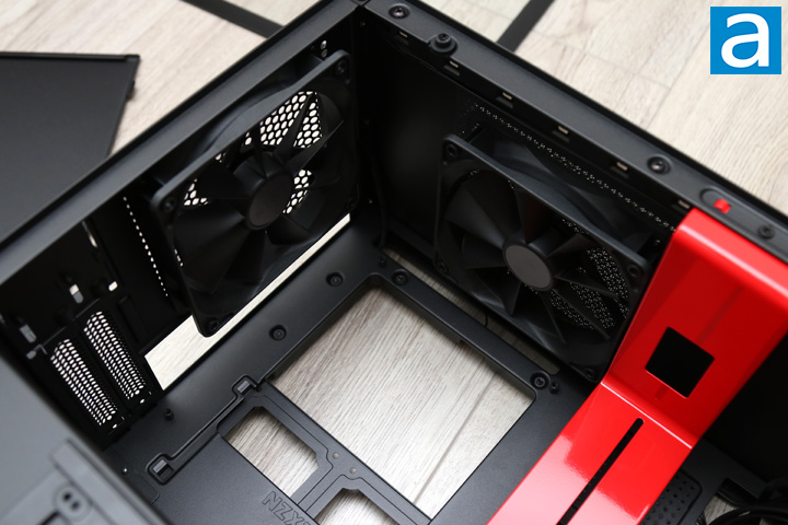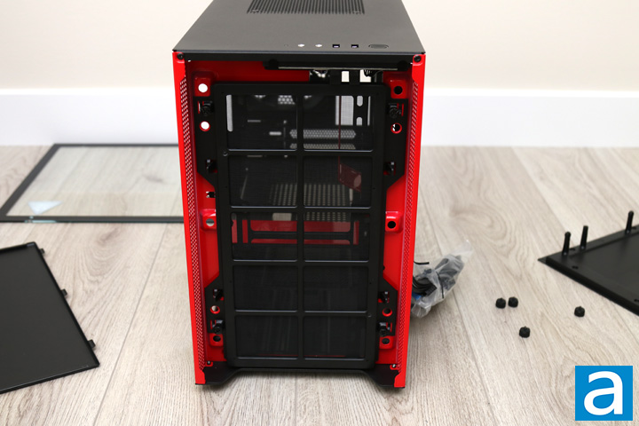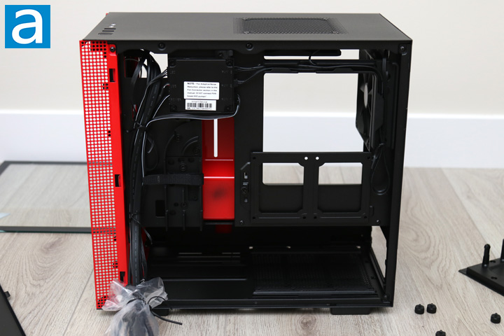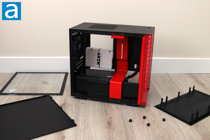 After you open up the panels, you can get a closer look at the inside of the NZXT H200i. The layout is similar to the H700i, albeit on a smaller scale. As such, we have a bright red metal bar down the front with a relatively open area for the motherboard and expansion cards. The power supply shroud cover is found in black at the bottom of the case. This separation divides the motherboard area from the power supply basement, which is pretty standard. This shroud has circular holes on the top of this panel to allow air to pass through. Considering how close your expansion cards may be to this bottom, it makes sense NZXT has placed some ventilation here. Otherwise, the area with the rectangular opening can only fit motherboards in the mini ITX size. Overall, the layout is pretty open. With practically nothing between the front and back of the H200i, this should allow for air to flow easily through.