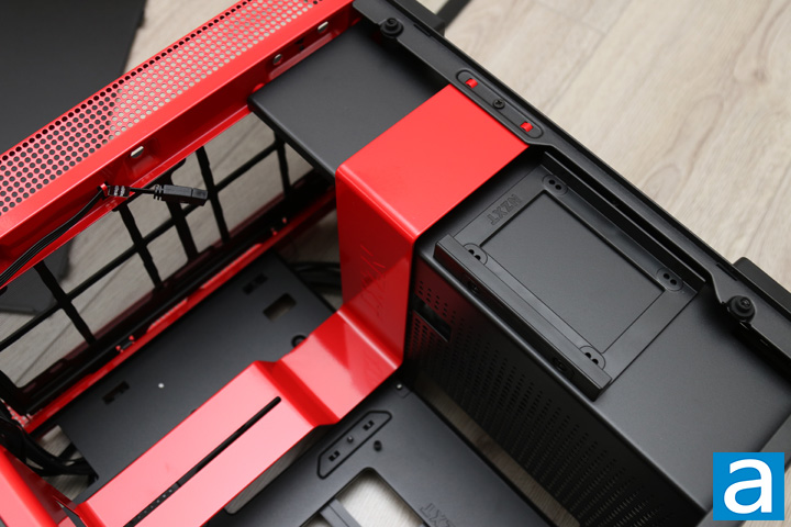 Near the front of the case, there are a few more interesting things to point out. For one, we have a drive sled where you can mount a 2.5 inch drive. As there is a routing hole behind the red metal bracket, you can easily lead your cables here. You can also see another opening on the power supply, where you can lead more cables to your expansion card. The red bar hides the primary routing holes at the back, which make for a cleaner cabling job. There is ample space here to sit cables here without them spilling out on either side. Again, you can see the front and its space where you can mount different cooling options. This area extends into the basement of the power supply, so mounting fans there will cool above and below the PSU divider.