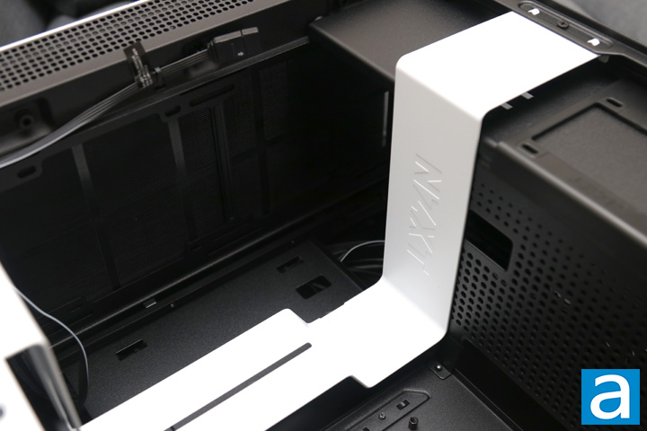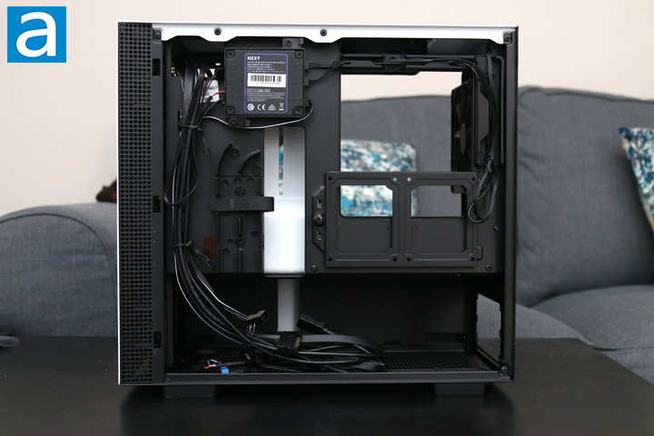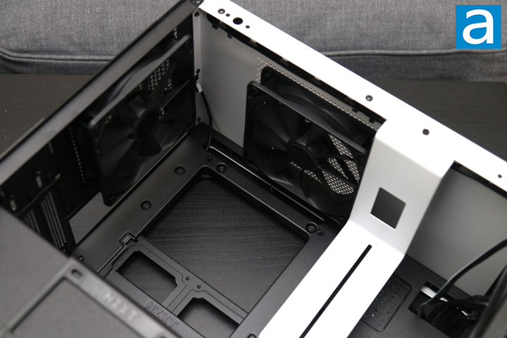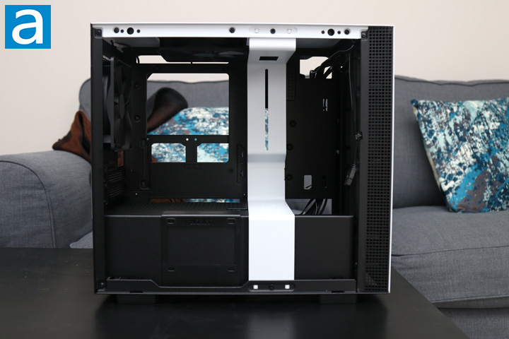 After you open up the panels, you can get a closer look at the inside of the NZXT H210i. From here, you can see similar elements such as the contrasted metal bar down the front and an open area for the motherboard and expansion cards. The power supply shroud cover is at the bottom of the case. This separation divides the motherboard area from the power supply basement, which is pretty standard. This shroud has circular holes on the top of this panel to allow air to pass through. This is good since your expansion card will be quite close and thus should allow airflow around here. As we have mentioned previously, the area here can only fit motherboards in the mini ITX size. The layout remains quite open for air to flow in from the front and out the back.