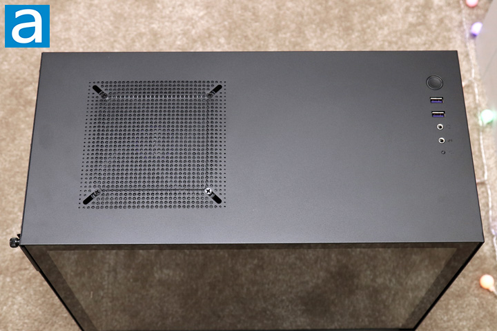 As for front facing input and output, we have a pretty standard set of ports here. For one, we have the power button that is outlined with a clear plastic ring that glows white when the computer inside is active. Next, we have two USB 3.1 Type A Gen. 1 ports, followed by two standard 3.5mm audio jacks for headphone output and mic input. Finally, we have a small reset button. At the other end of the top panel, we have an opening for cooling options here. A 120mm fan is preinstalled here to push air out of the chassis. However, you can also put a 140mm fan here if you so desire. A thin mesh lining is placed in between the fan and the opening to prevent dust from entering here.