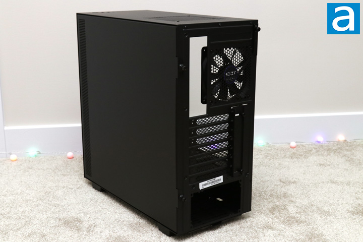 As for the rear of the case, you can see we have a pretty unsurprising area here. At the top, we have the motherboard cutout with space for exhaust in a honeycomb pattern beside it. A single 120mm fan is already mounted here and it can only be installed in this position rather than on a rail where it can slide up and down based on your needs. Underneath, we have seven expansion slots for horizontal placement, as well as two more vertical slots for those who desire to place their graphics card in that orientation. I should note NZXT has not included any mounting equipment for vertical GPU placement, so you will need to use your own riser stand and cable for this to work with your gear. You can also see a better look at the left side panel, which is a standard steel one. This panel has some perforations at the front to allow air through to the front. The back is fitted with a plastic mesh filter to prevent dust from getting into the case.