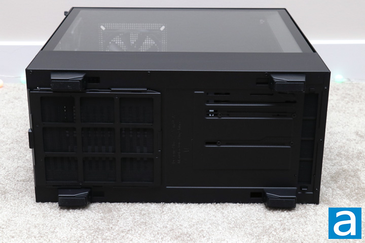 Flipping to the bottom of the NZXT H500, we can see some pretty standard things. In each of the four corners, we have feet that extend out with rubber soles on the bottom. This allows the case to make clearance from the surface it sits upon in addition to allowing air to pass freely in here. At the back we have an opening for the power supply, along with a plastic-framed mesh to prevent dust from entering into your PSU. At the front we have an opening to allow air to come in through any front input fans. Like the other front input, this is lined with a mesh finish to stop dust in its track. Finally, you can see some screws that hold the drive cage in place, as you will see later on in our review. The drive cage is held on rails so it can be moved around depending on your needs.