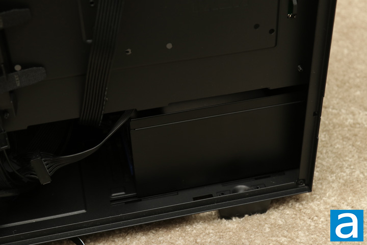 As usual, I started out by installing the power supply in the basement and routing all the necessary cables to the expected spots. As you can see, with the hard drive cage installed in the current position, there still is ample amounts of space for your power supply and even additional cables you may want to hide in the basement area. I ended up using the large routing area at the front for the motherboard as well as directing my CPU power cable straight up to the routing hole at the top. As for power supplies, you can install up to a 260mm length unit, including any cables, with the drive bay at its default position. Moving this forward will not affect any front cooling options since they do not dip into this lower portion. You can also remove the cage altogether if it is not used or if you need more of the space. My SilverStone Strider Gold S ST85F-GS 850W unit is a relatively compact unit, so I did not have to move anything, and was able to tuck extra cables into this area. As for routing its cables, I was content with the sufficient number of openings to plug everything in. Between the side, top, and bottom holes, I was able to plug everything in without exposing too much cable.