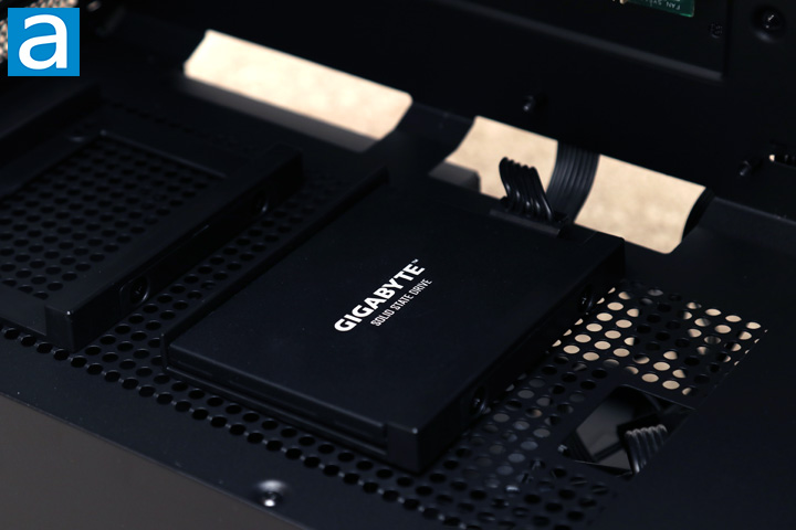 In terms of drive options, we have the drive cage at the back of the motherboard for 3.5" drives. While I did not install any of these drives, I should note you have to remove the entire cage and install the drives directly into this metal box. This can be a bit annoying, especially since removable drive sleds are more common and work better. I installed a Gigabyte UD PRO 256GB 2.5" SSD at the front with the plastic piece attached to the power supply shroud. I really like this mounting place and how they implemented. However, with only two here, you can really only install a maximum of two 2.5" drives in the machine in addition to the cage holding two 3.5" options. This is not necessarily limited, but those with many drives may want to look elsewhere. As aforementioned, these drive brackets are attached to the holes on the bottom of the division, letting you mount it as you please. Overall, installation was a cinch and very easy to do. With ample component clearance and a surprisingly sufficient space behind the motherboard tray for cabling, I had no issues while installing my build.