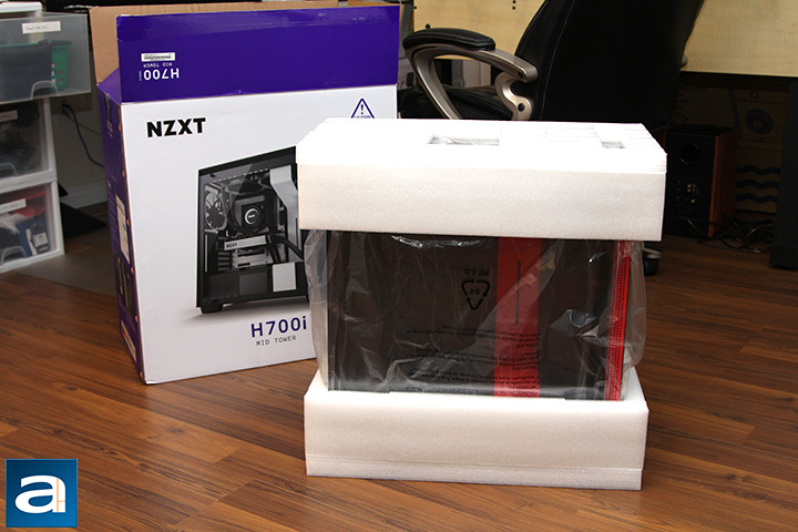 As mentioned earlier, the design on the two principal faces of the NZXT H700i's retail packaging is different. The NZXT H700i mid-tower is found wrapped in a clear plastic bag and clipped between two large Styrofoam brackets upon cutting open the tape at the top. The packaging is quite standard for a computer case, and in the end, everything inside arrived in perfect condition. Needless to say, I do not have anything to complain about. Accessories are found inside a box placed on a hard drive tray inside the case.