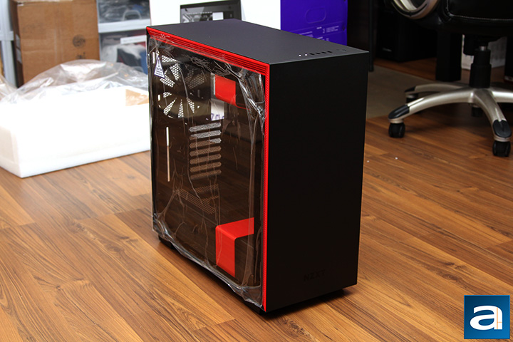 The NZXT H700i mid-tower is the largest of the H-series, which is available in micro-ATX with the H400i and mini-ITX form with the H200i. While one could reasonably make the assertion that the H700i is yet another computer case designed by someone with a ruler, its sleek lines, mesh edges, and especially the sharp red-on-black coordination of our particular model has every thread of boring eliminated in my opinion. It is kind of like the In Win 805, but interpreted in a different manner. The front panel is a matte black flat piece of steel consistent with the design theme; where mesh openings on the side provide ventilation for the three Aer F120 120mm intake fans in front. Taking off the front panel will reveal a large washable magnetic dust filter to keep the nasty stuff out, which is something I appreciate. Meanwhile, a tinted full-sized tempered glass panel on the left side of the H700i provides a full, unobstructed view inside. The glass panel is attached to the main frame by four thumbscrews. The rest of the chassis is made out of quality steel panels.