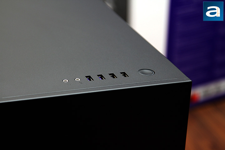The NZXT H700i's front panel connectors are located on top like many new chassis. It sits fully exposed all the time, which is convenient, but keep a can of compressed air around to clean the dust out once in a while. The layout configuration is pretty standard; starting from the left, we have two 3.5mm audio jacks for headphone out and microphone in, two vertically oriented USB 3.1 Gen 1 ports, two vertically oriented USB 2.0 ports, respectively, and a power button. The circular power button has an illuminated perimeter that glows steady white when turned on. A second white LED hidden inside on the left flashes when there is HDD activity.