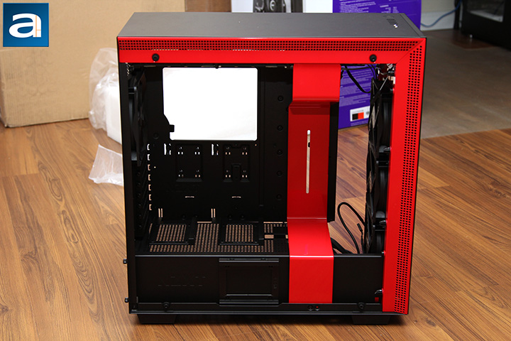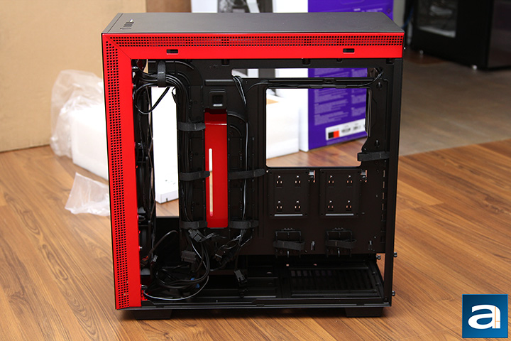 Consistent with its exterior, the interior of the NZXT H700i is also well furnished with all surfaces painted matte black. To further accentuate its color scheme, a red strap in the middle used to hide cables runs from the top to the bottom of the case is present, along with a few other surfaces also painted red. As with all modern chassis, there are no front 5.25" drive bays for clear, unobstructed airflow. The conventional layout has the power supply mounted at the bottom in a separate chamber with lots of room allocated for the motherboard. Generally speaking, the layout is mostly standard as far as ATX computer cases are concerned.