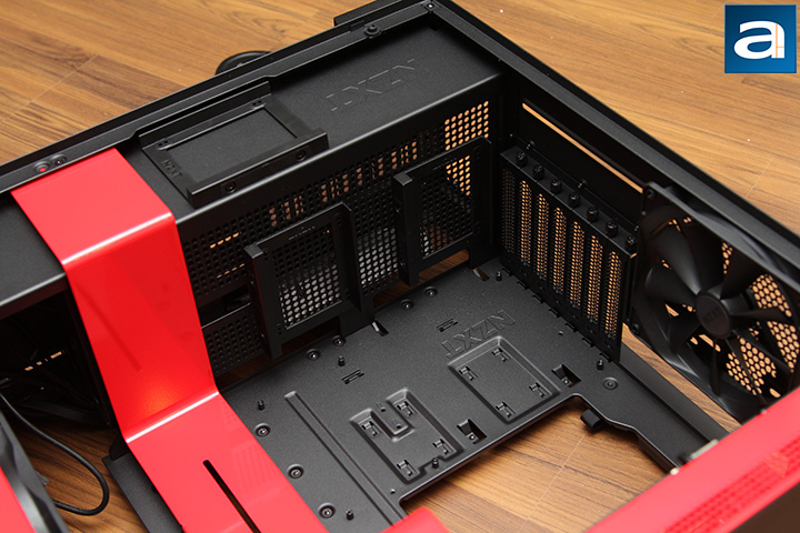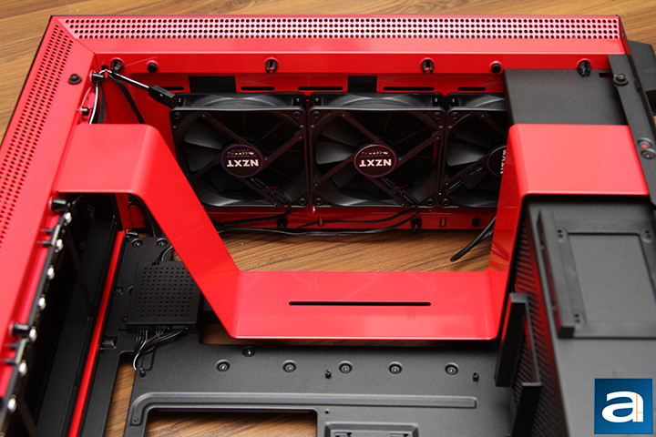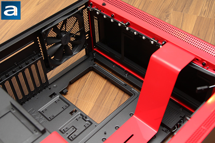 Since the shroud separating the main chamber and the power supply chamber is fully ventilated, there is only one thermal zone inside the NZXT H700i. Here, you can mount two 2.5" drives, and are located next to the large openings at the back for easy cable routing. A third SSD can be installed vertically on the shroud. The vertical SSD tray is immediately adjacent to the red strap, which makes routing and hiding cables easy to accomplish.