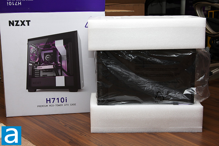 As mentioned earlier, the design on the two principal faces of the NZXT H710i's retail packaging is different. The NZXT H710i mid-tower is found wrapped in a clear plastic bag and clipped between two large Styrofoam brackets upon cutting open the tape at the top. The packaging is quite standard for a computer case, and in the end, everything inside arrived in perfect condition. Needless to say, I do not have anything to complain about. Accessories are found inside a box placed on a hard drive tray inside the case.
