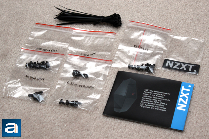 As I have mentioned previously, there is a small box wedged by the feet of the Manta, and this holds all the small screws. As you can see, this includes screws for mounting the motherboard, power supply, an additional fan, and storage drives. I wish there was a better system for NZXT to use to make it easier in identifying the different screws, such as direct labels on the bag, but it is not a huge issue. This being said, it is hard to compete against Phanteks and their small toolbox they provide with their cases. There is also a bundle of black zip ties, an NZXT badge, and a small pamphlet showing off other NZXT products. Of course, this is not what you are actually interested in, so without further ado, we head to the big fish, or the Manta in this case.