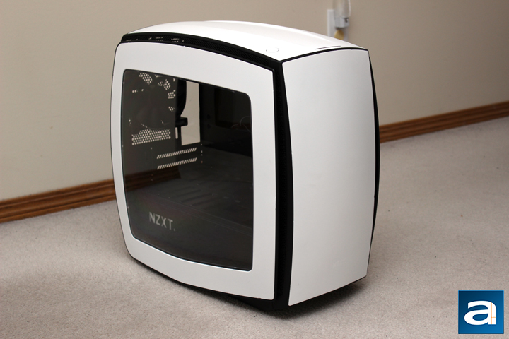 While the NZXT Manta may not be sleek in your opinion, I think there is sleekness in the details. Some examples are the black border lines doubling as ventilation holes, or the hidden power button and LED indicator residing inconspicuously on the case. Even better is the hidden NZXT branding on the front panel, which may be hard to see in the photos. There are also some subtle indented lines at the top panel to add some more style. According to NZXT, the Manta is actually based off of the Ferrari 458 -- which I did not get to drive at the press event -- and you can kind of see some of the design points. The finish on the case is not a smooth finish, but has a bit of grit to it. The NZXT Manta we have today is in a matte white finish, which is somewhat of an uncharted territory. We have not seen many white chassis, let alone matte ones, as they can be easily marked up. I think the matte white looks great, but if matte white is not your thing, NZXT also has a pure matte black, and a matte black/red version. A large clear plastic window is shown on the left panel, and it is one of the largest window-to-body size ratios we have seen. If you are afraid of showing off your components, NZXT also has a windowless version, albeit only in matte black.
