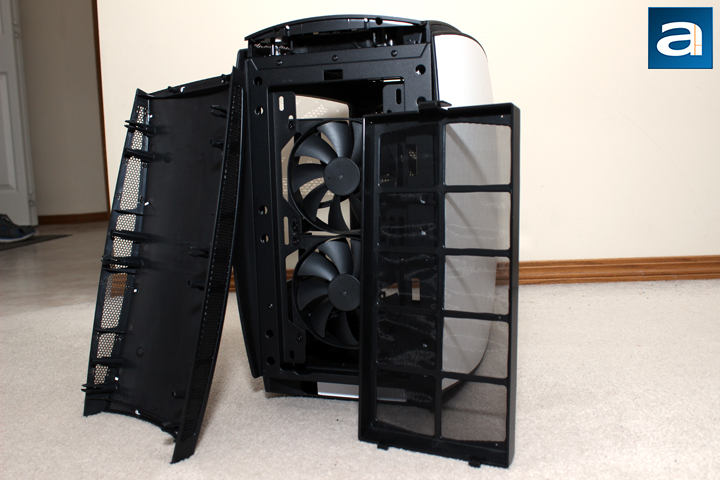 Taking off the front panel, and we have some additional things to talk about. The front panel pops off easily, as it is held in by some plastic pegs. Underneath, we have a large protruding mesh filter, which is intended to stop dust from entering. Behind this are two included NXZT fans, pointed inward to pull air in. The front can house two 120mm or 140mm fans, or a radiator up to 280mm in length. Since the mesh filter protrudes out, it is theoretically possible to put fans on the other side of the mounting rails, which could be helpful. Due to the lack of demand for 5.25" drives in general, again we have a case with no optical drive capability, but this is completely understandable. On the other hand, this ends up improving airflow inside, but we will see more when we look inside.