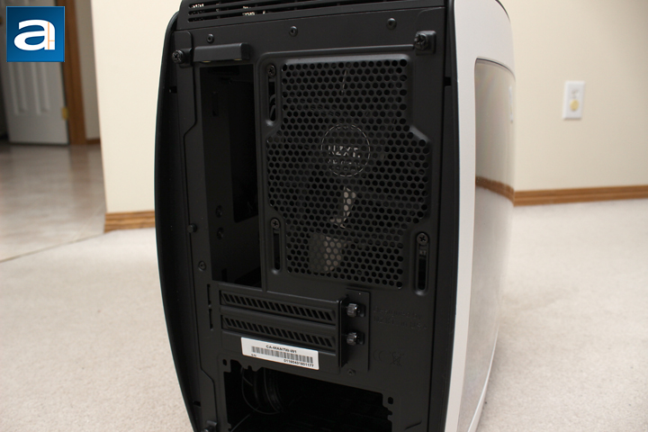 From the back, the first thing I notice on the Manta is a 120mm exhaust fan, mounted on some rails. Unfortunately, a 140mm fan cannot be placed here, but this is understandable considering the size constraints. To the left of the fan is a large opening for the motherboard I/O shield. There is a small plastic protrusion on top, and this houses some white LEDs. Along with a button placed on the back, you can toggle it to illuminate the I/O shield and the inside NZXT logo, as you will see later on. I think this is a really helpful addition, as it reduces the chances of fumbling around the back of the computer when connecting and disconnecting your peripherals and other I/O. Next are the two black expansion port coverings, indicating this can hold most everyday expansion cards, such as GPUs. As mITX motherboards only have one PCIe expansion slot, I can see why there are only two brackets. Both of the brackets are tool-free with some thumbscrews. NZXT has tightened all of the screws first, so you may need to use a screwdriver the first time around when removing the brackets. At the bottom, we have an opening for a power supply. The NZXT Manta is capable of holding a full-sized ATX PSU, which is good to see.