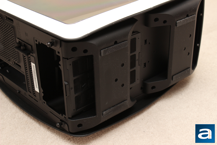 From the bottom, you can see how the NZXT Manta stays upright. With two protruding legs at the front and the back, this ensures there is enough clearance for airflow, even on undesirable surfaces like carpet. Four rectangular rubber feet also are located at the bottom of the legs, and these are meant to reduce the vibration created between the floor and your case. Near the back is also a removable air filter, which is meant to filter dust from getting into the power supply. It would be nice if this filter was actually removable from the front, as we have seen in some other cases, but it is not a big deal either. With all of this out of the way, let us dive inside the Manta.